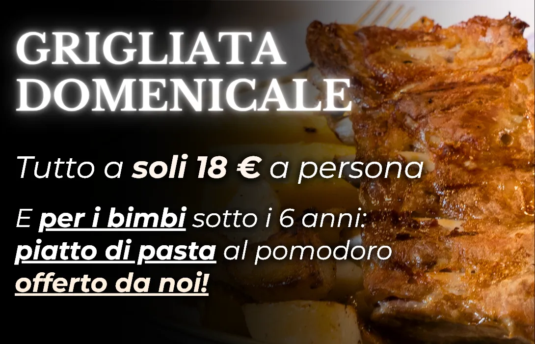 Il menù grigliata viene servito all’intero tavolo, ai bambini al di sotto dei 6 anni un piatto di pasta lo offriamo noi (max 2 per tavolo).